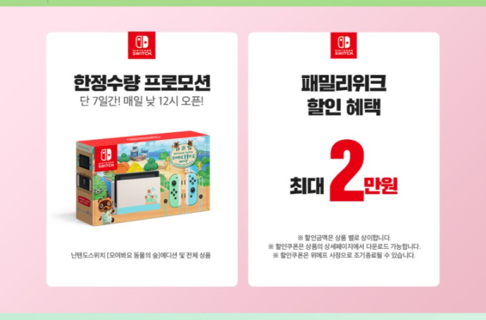 위메프 5월 가정의 달 프로모션 닌텐도 패밀리위크는 PC, 모바일의 위메프 사이트 또는 앱에서 닌텐도 스위치 동물의 숲 에디션 7일간 매일 낮 12시 한정수량 판매한다.